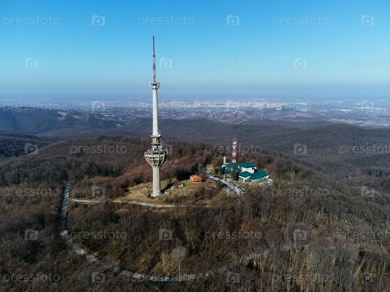 Вид с воздуха на телебашню, бомбардированную армией НАТО в 1999 году, Irishki venac, башня Фрушка, Нови-Сад, Сербия, Европа