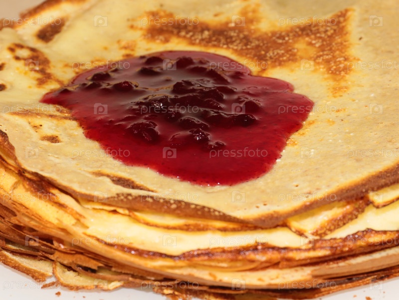 Красивый малиновый варенье течет над кучей красных блинов