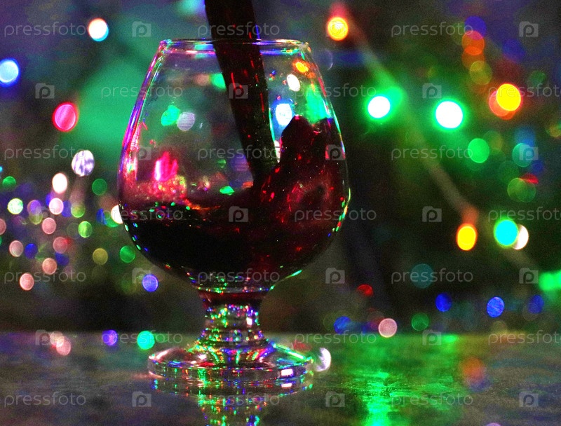 Струя красного вина, когда она наливается в стакан на праздничном фоне