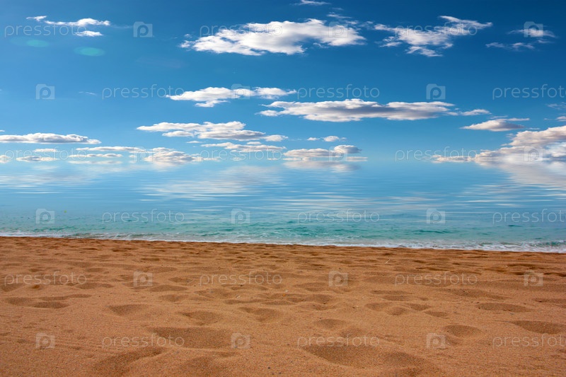 Красивый песчаный пляж и солнечное небо как место для активного отдыха