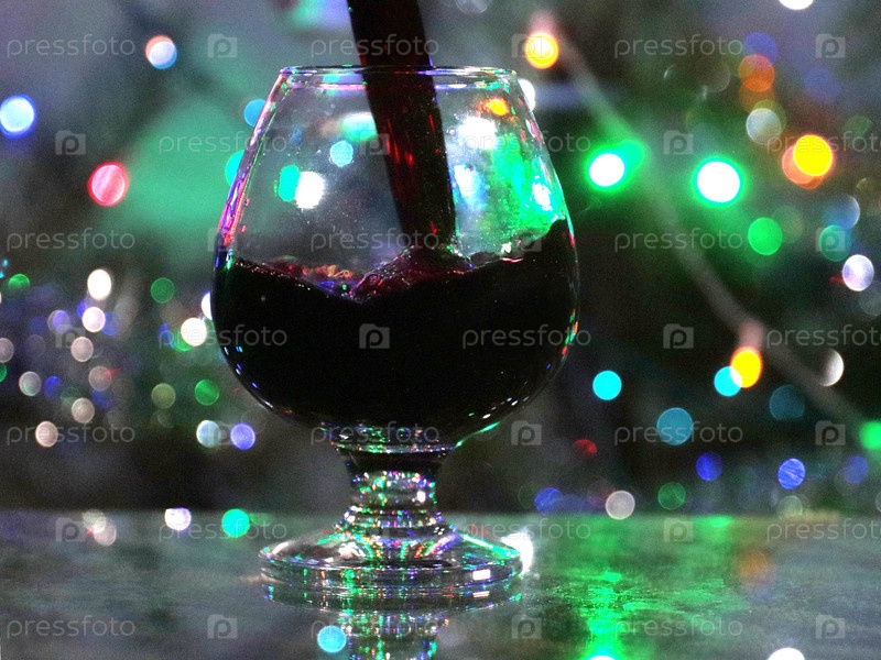 Струя красного вина, когда она наливается в стакан на праздничном фоне