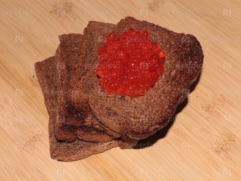 Кучу красной лососевой икры на флейте пшеничного хлеба на завтрак