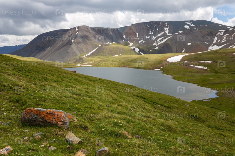 Вид сверху ледникового озера в высокой горной долине в пасмурный летний день на фоне заснеженных Альтайских гор, Сибирь.Путешествия и исследования во время отпуска