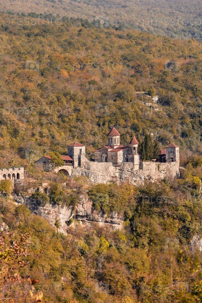 Осенний пейзаж лесистых горных склонов и Монастырь святых Давида и Константина, более известный как Motsameta, средневековый православный монастырь в регионе Имерети Грузии