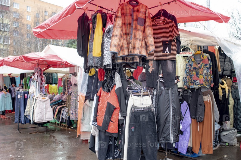 Лоток с одежной и аксессуарами на рынке. Москва