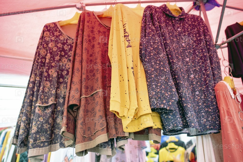 Лоток с одежной и аксессуарами на рынке. Москва