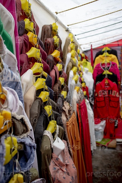 Лоток с одежной и аксессуарами на рынке. Москва