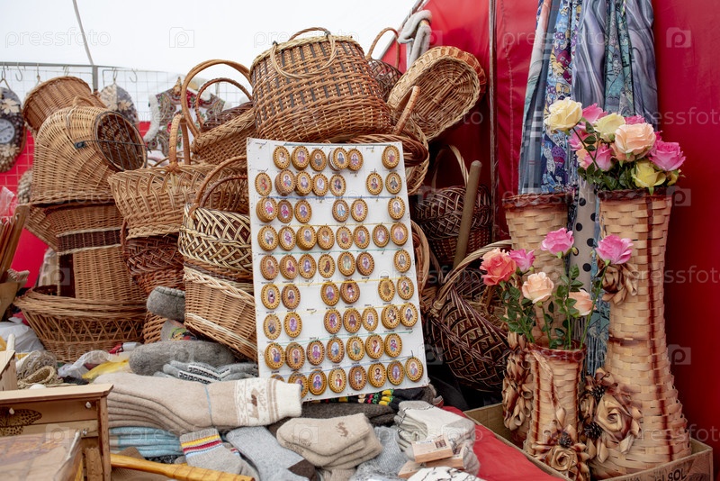Лоток с традиционными русскими изелиями на рынке. Москва