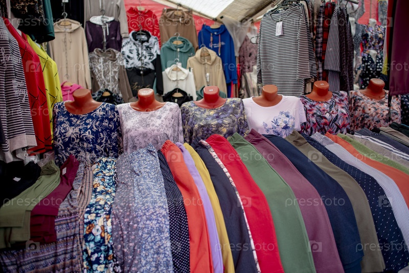 Лоток с одежной и аксессуарами на рынке. Москва