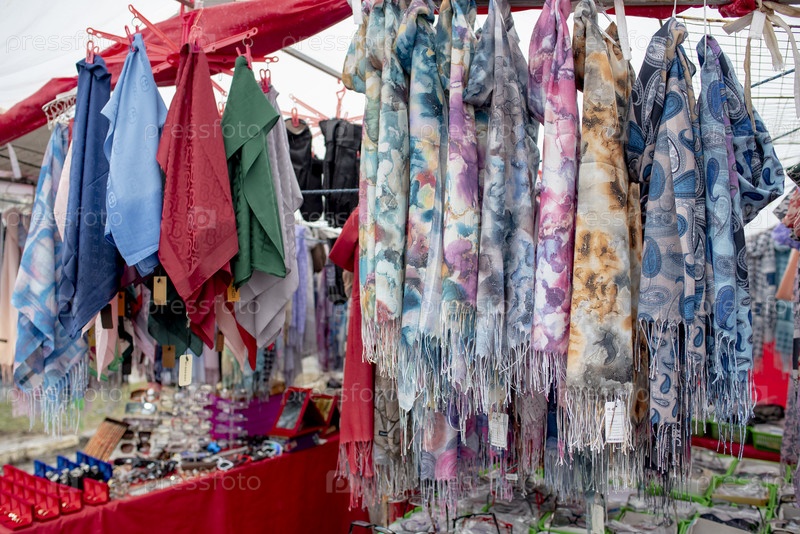 Лоток с одежной и аксессуарами на рынке. Москва
