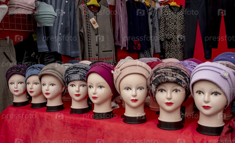 Лоток с одежной и аксессуарами на рынке. Москва
