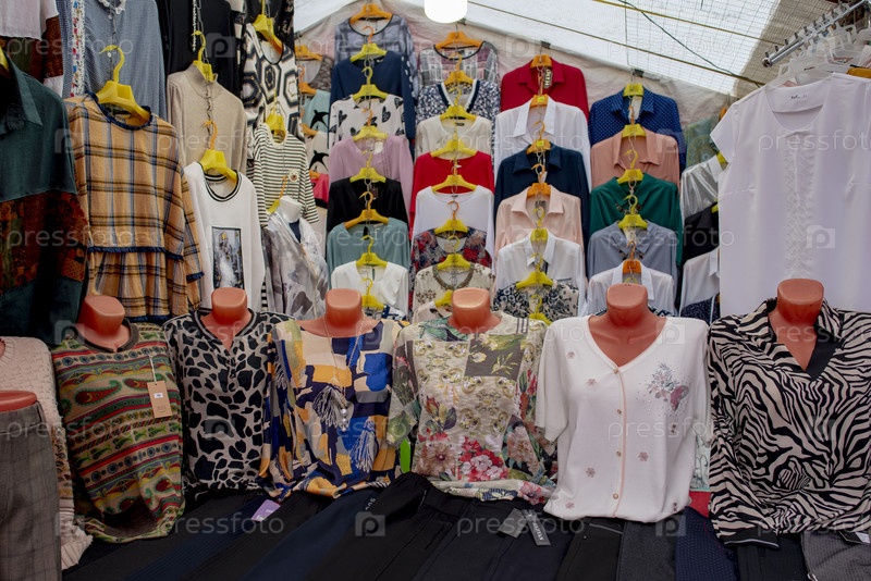 Лоток с одежной и аксессуарами на рынке. Москва