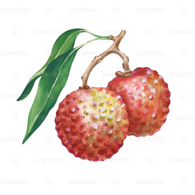 Два спелых экзотических личи с зелеными листами, изолированными на белом фоне