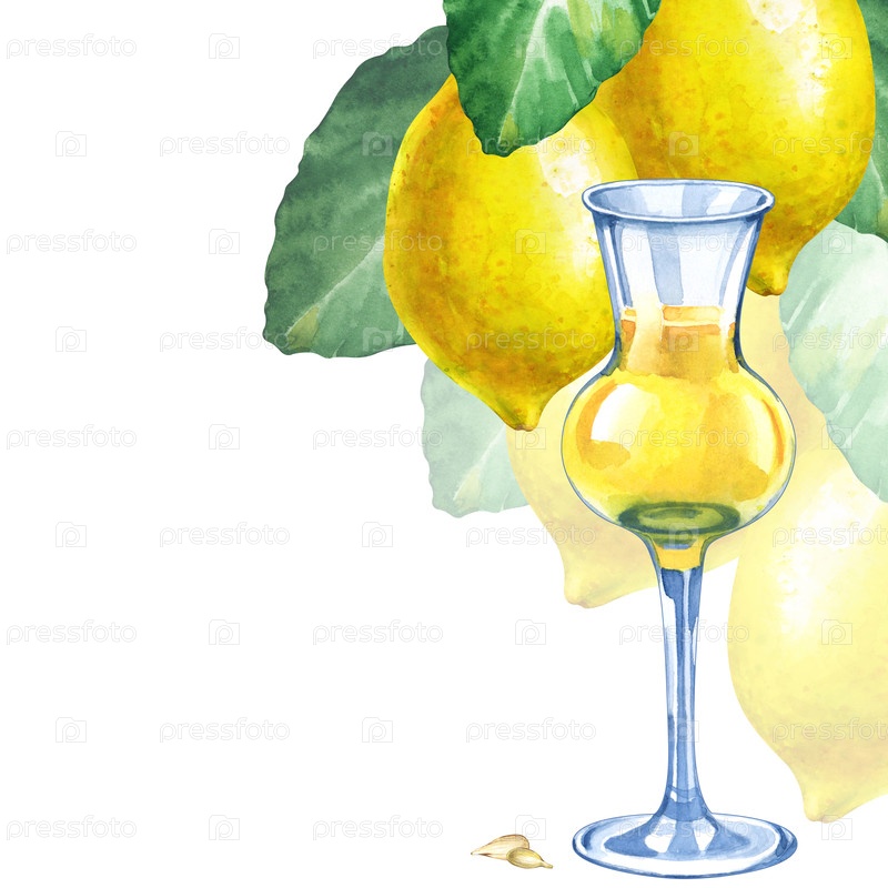Элегантный стакан с ликером, целые лимоны на ветке с листьями на белом