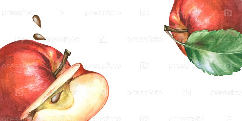 Горизонтальная акварельная рама с спелыми красными яблоками на изолированном фоне. Ботаническая иллюстрация со всем яблоком с зелеными листьями, нарезанным на четверти и рассеянными семенами яблок. Для баннеров веб-сайтов, кулинарных блогов, этикеток орга