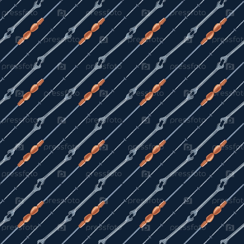 Диагональный бесшовный шаблон с отвертками, ключами и самонажимающимися винтами. Акварельная иллюстрация инструментов металлообработки на темно-синем фоне. Реалистичный безшифровый шаблон для проектирования ремонтных мастерских и строительных предприятий,