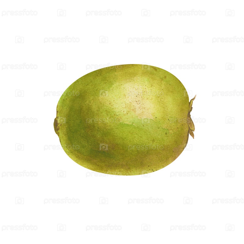 Ручно нарисованная акварельная иллюстрация цельного спелого фрукта киви. Реалистичная текстура коричневой тусклой кожи с мягкими зелеными оттенками. Высококачественный ботанический элемент для дизайна здоровых продуктов, рецептов смузи, упаковки органичес
