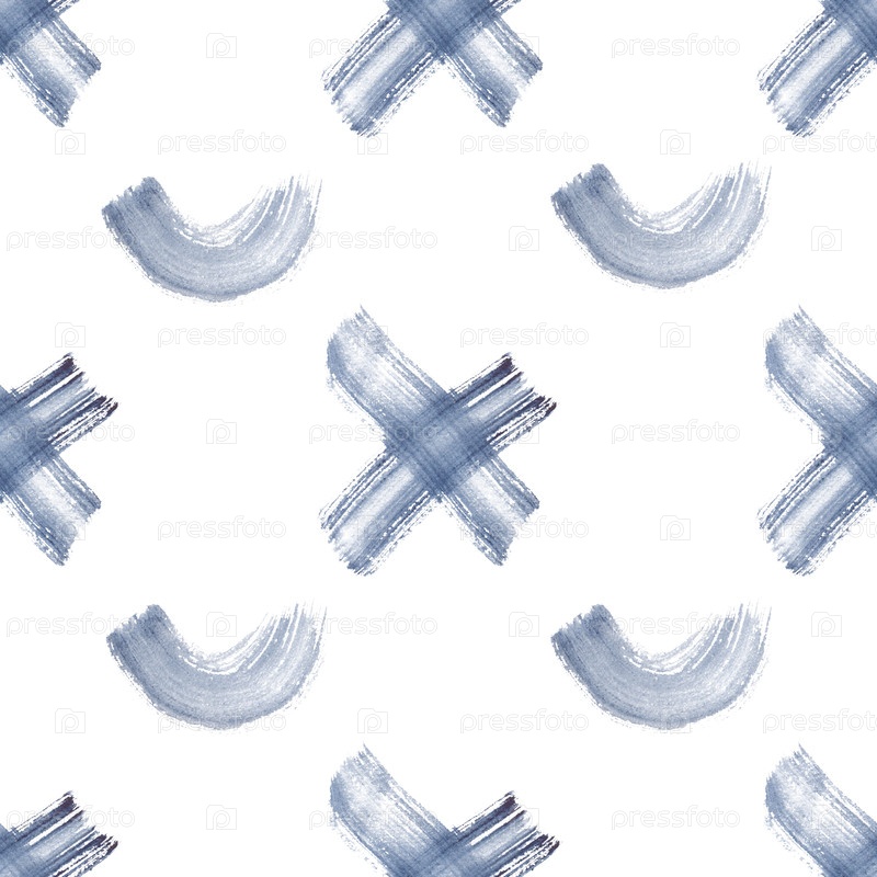 Минималистский акварельный рисунок ручной живописи с бесшовным узором, содержащим абстрактные мазки щеткой в синем индиго и сером сланцевом цвете. Художественный геометрический фон с сухой текстурой кисти. Модный дизайн в скандинавском стиле для текстиля,