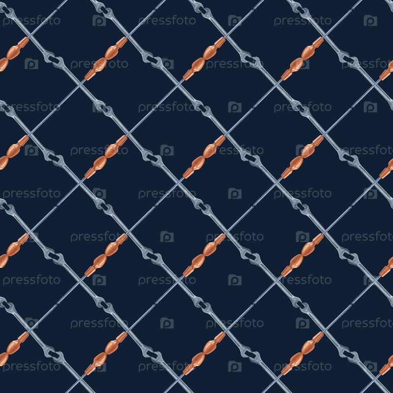 Бесшовный рисунок с отвертками и ключами, расположенными в крестообразном узоре. Акварельная иллюстрация металлических инструментов на темно-синем фоне. Реалистичный бесшовный шаблон для обоев, печати, текстиля, упаковки
