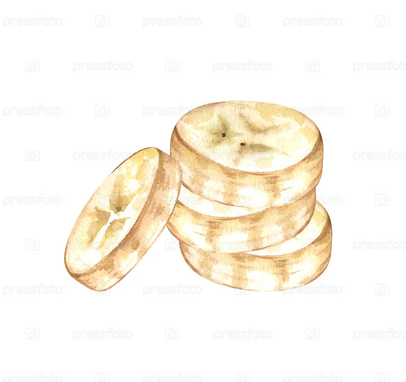 Акварельная иллюстрация нарезанных кусочков бананов. Ботаническое искусство с небольшой стопкой круглых ломтиц . Высококачественное изолированное на белом фоне. Идеально подходит для упаковки смузи, брендинга здоровых закусок, книг рецептов и декора кухни