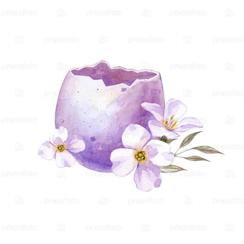 Акварельная иллюстрация сломанной яичной скорлупы и белых весенних цветов с зелеными листьями. ботаническая композиция с мягкими пятнами на изолированном фоне. идеально подходит для пасхальных поздравительных открыток, украшений весеннего праздника, цвето
