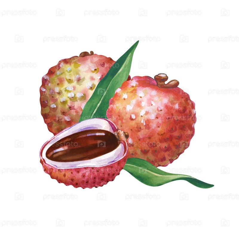 Акварельная иллюстрация тропических фруктов личи. два спелых красных цельных личи с зелеными листьями и один сочный полувырезанный плод, показывающий белую мякоть и коричневые семена. ботанический элемент для упаковки экзотической пищи, летних этикеток со