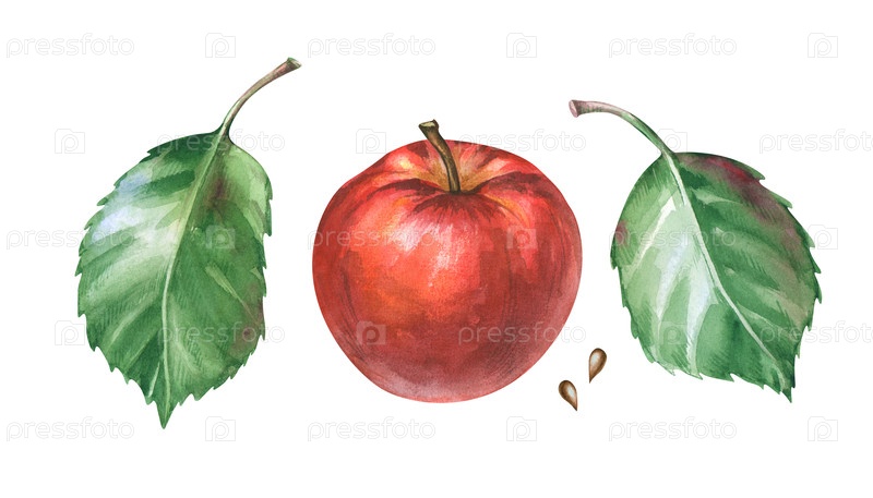 Акварельная иллюстрация сочного красного яблока. набор с цельным спелым плодом с реалистичной текстурой кожи, двумя ярко-зелеными листьями и небольшими семенами яблок. ботанический клипарт для упаковки органических продуктов питания, брендинга фермерского