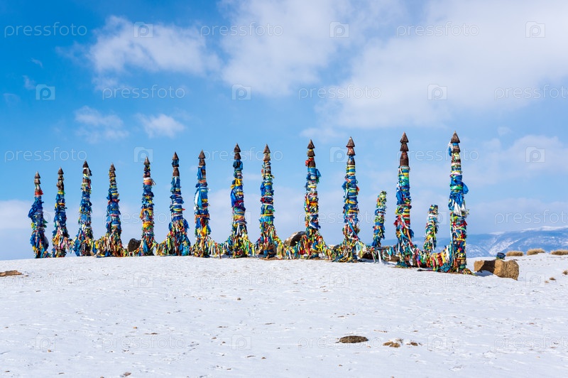 Деревянные ритуальные столбы с красочными лентами на мысе Бурхан