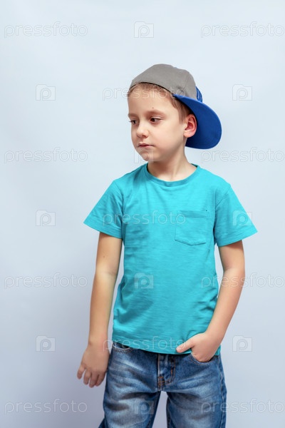Маленький мальчик в синей футболке и джинсах стоит с рукой в кармане, смотрит со стороны нейтральным выражением лица