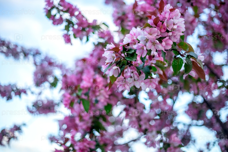 Розовые и белые цветы сгущаются на ветвях деревьев, окруженные пышными зелеными листьями.Фокус находится на переднем плане, создавая контраст с размытым фоном