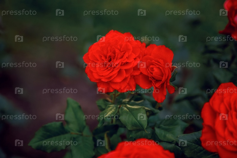 Вибрирующие красные розы цветут среди пышных зеленых листьев, демонстрируя свои слоистые лепестки и естественную красоту.Мягкий фокусный фон улучшает яркие цвета цветов на переднем плане