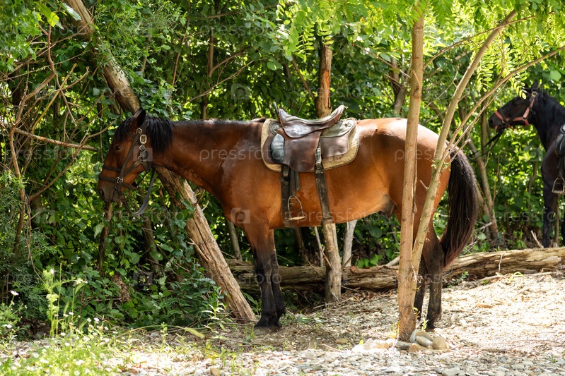 Лошадь с седлом в лесу