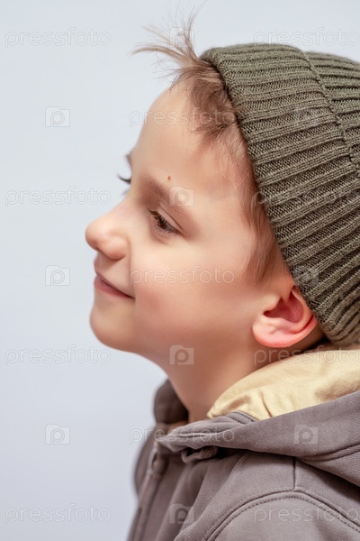 Улыбающийся ребенок с вязаной шляпой смотрит в сторону в профильном просмотре, одетый в коричневую толстовку
