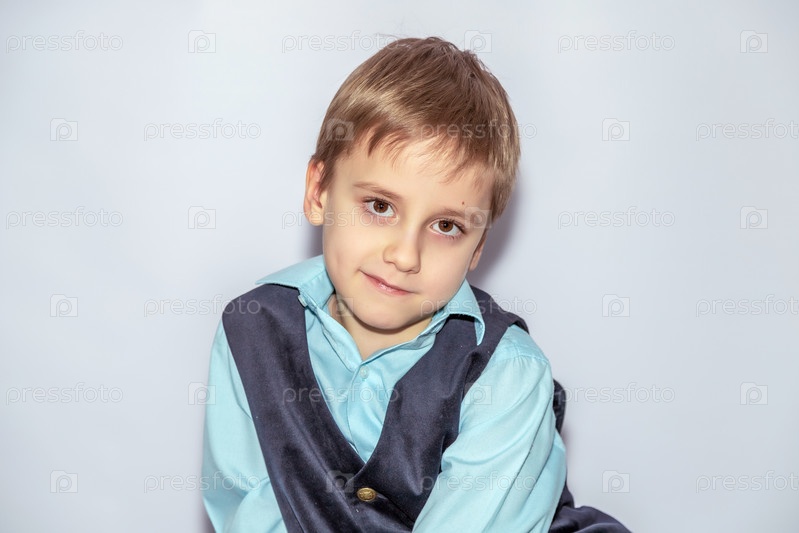 Маленький мальчик с короткими светло-коричневыми волосами, одетый в голубую рубашку и жилет военно-морского флота, небрежно натянутые над плечами, смотрит мягко на камеру со слегка улыбкой