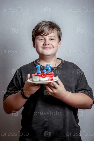 Улыбающийся мальчик держит небольшой торт с голубыми свечами в форме числа 13, он носит обычную темную рубашку и ожерелье