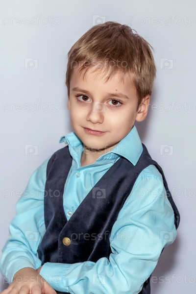 Маленький мальчик с светло-коричневыми волосами носит голубую рубашку и темный жилет, нежно смотрит в камеру со слегка улыбкой