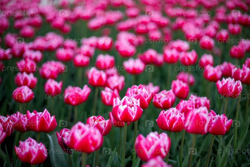 Вибрирующее поле, наполненное розовыми тюльпанами в полном цветении, с зелеными стеблями, видимыми снизу.Цветы пышные и плотные, создавая очаровательную и красочную цветочную сцену
