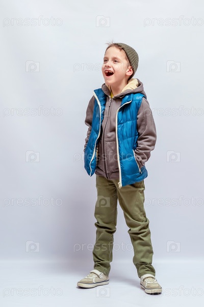 Юный мальчик смеется, на нем зеленая шапочка, синий жилет, серая куртка с капюшоном и оливковые брюки, он просто стоит со своими руками в карманах. светлые туфли. радостное, веселое выражение лица