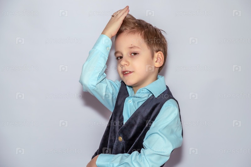 Молодой мальчик с коричневыми волосами позирует уверенно, одет в светло-синюю рубашку и темный жилет, рука лежит на голове