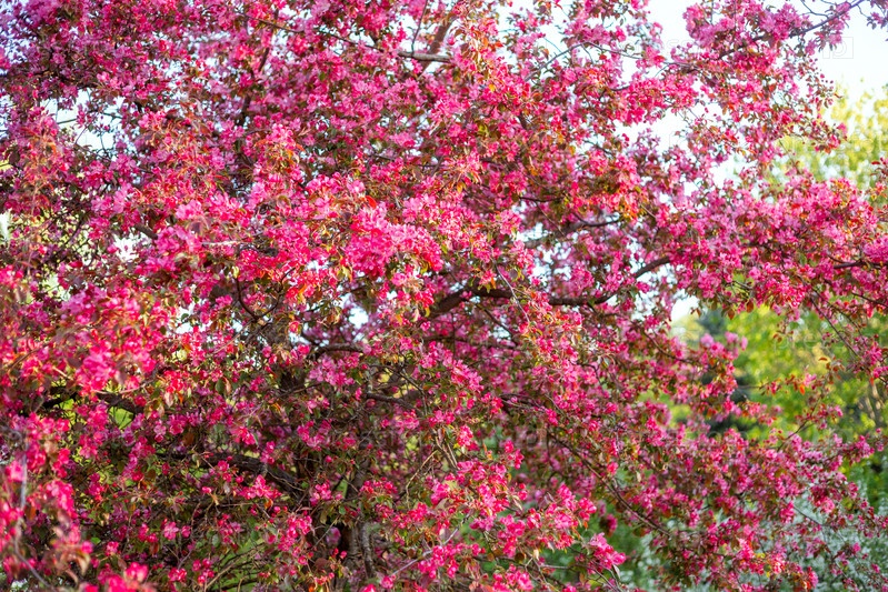 Розовые цветы плотно покрывают ветви, создавая яркий цветковый дисплей с маленькими зелеными листьями, проникающими сквозь них