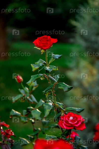Одинокая ярко-красная роза в полном цветении с темно-зелеными листьями, окруженной размытой садовой лиственницей. ствол имеет острые шипы. освещение улучшает яркий цвет и деликатную текстуру роз