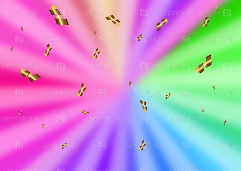 Красочный сияющий фон с золотыми геометрическими формами, разбросанными по яркому спектру розовых, фиолетовых, зеленых и синих оттенков, создает динамический, энергичный визуальный эффект
