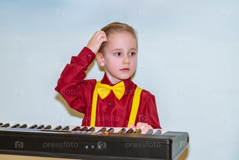 Маленький ребенок в красной рубашке с желтым бабочкой и подвесками, стоящий у клавиатуры, выглядит задумчивым
