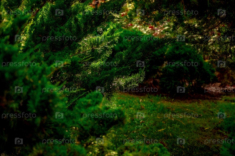 Плодородные зеленые кустарники с плотными листьями заполняют передний план, а под ними видно травянистое место.Солнечный свет фильтрует через листья, создавая естественную и спокойную атмосферу