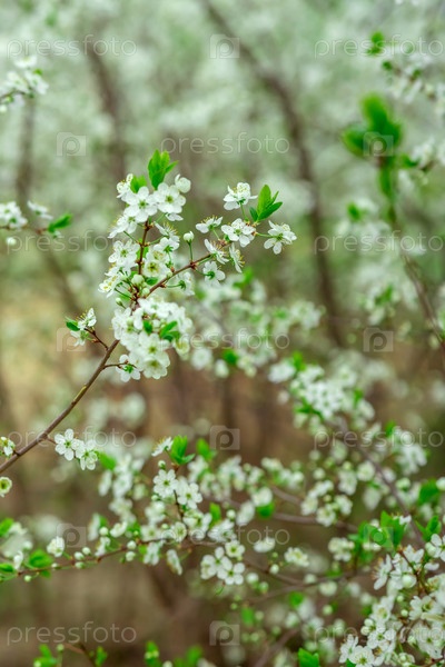 Нежные белые цветы на тонких ветвях с ярко-зелеными листьями символизируют весеннее обновление.Мягкий фокусный фон улучшает цветочный дисплей, создавая спокойную сцену естественной красоты