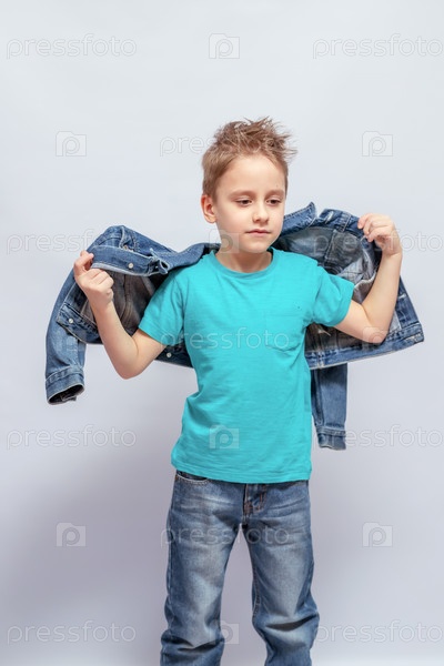 Молодой мальчик с короткими волосами надевает или снимает джинсовую куртку, носит бирюзовую футболку и синие джинсы.Он уверенно стоит с нейтральным выражением лица в помещении