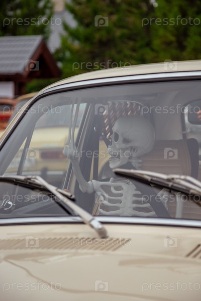 Скелет сидит на водительском сиденье старинного автомобиля, видимый через лобовое стекло.Сцена захватывает юмористическое сопоставление с пышной зеленью в фоне