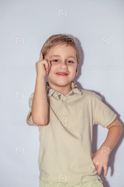 Маленький ребенок улыбается, одет в светлую футболку поло, стоит с одной рукой на бедре и другой направленной вверх
