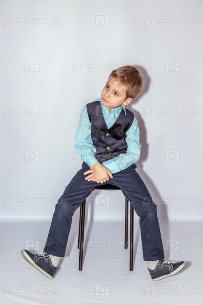 Маленький мальчик в светло-синей рубашке и темном жилете сидит на стуле, ноги раздвинуты друг от друга, смотрит в сторону
