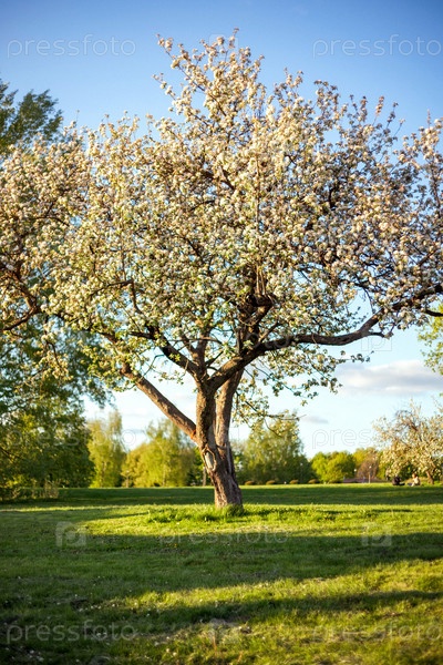 Цветящее дерево с белыми цветами стоит на солнечном травянистом поле, окруженное пышной зеленой листьями.Голубое небо и рассеянные облака обеспечивают спокойный фон, захватывая весеннее тепло